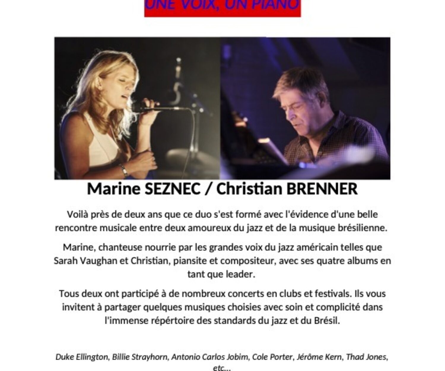 Actualités, jazz 10 Juil 2024 L’Art Jazz Bretagne invite Deborah Tanguy pour deux concerts à Quimper et Pluguffan Les Couleurs Le mercredi 31 juillet 2024 de 18H30 à 20H30. Trio Déborah TANGUY (vocal), Christian BRENNER (piano) et Jean-Pierre REBILLARD… Christian Brenner